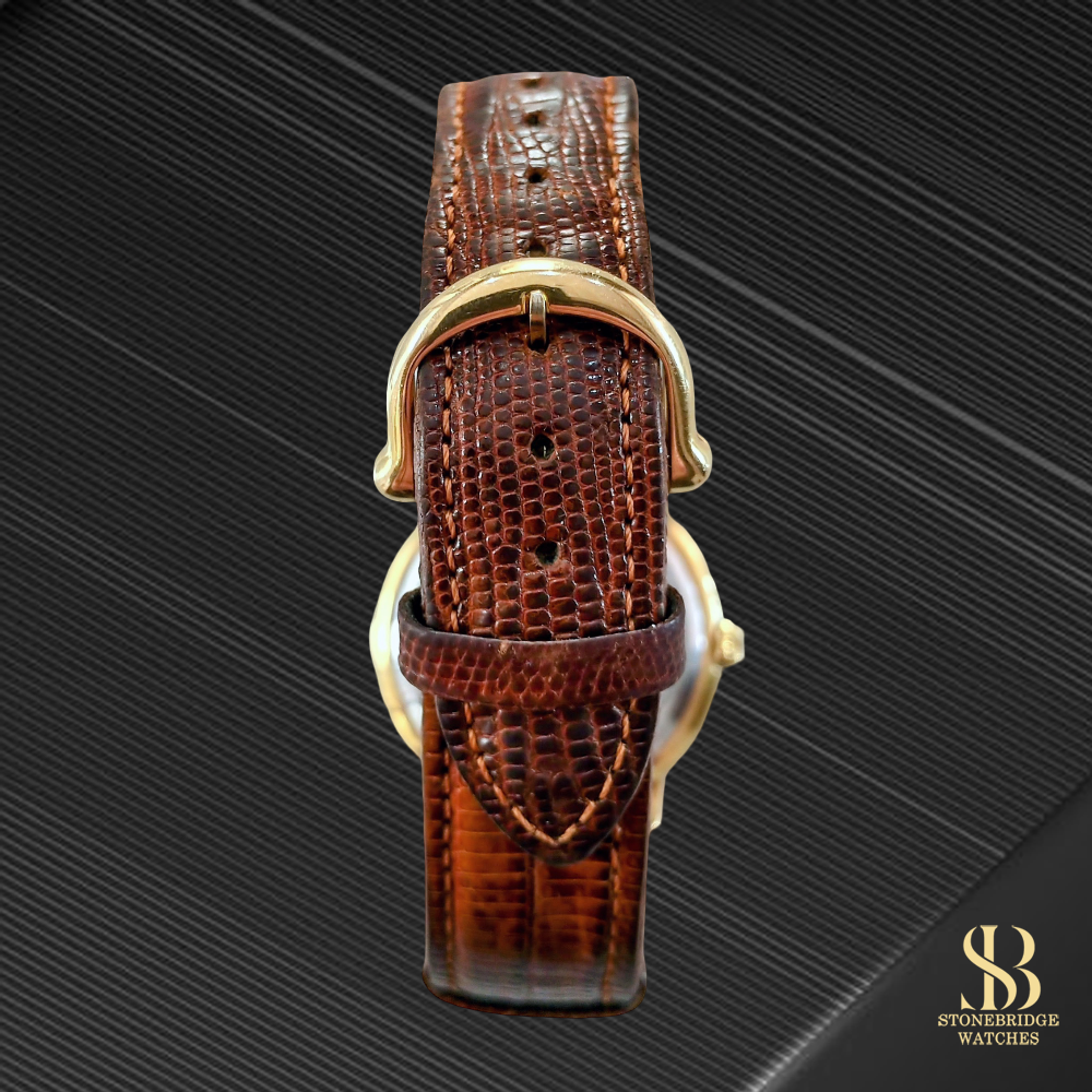 Housed in a gold-plated 36mm case, the watch sits comfortably on the wrist and pairs effortlessly with both formal and smart-casual attire. It is powered by a reliable Swiss automatic movement, delivering dependable daily performance.