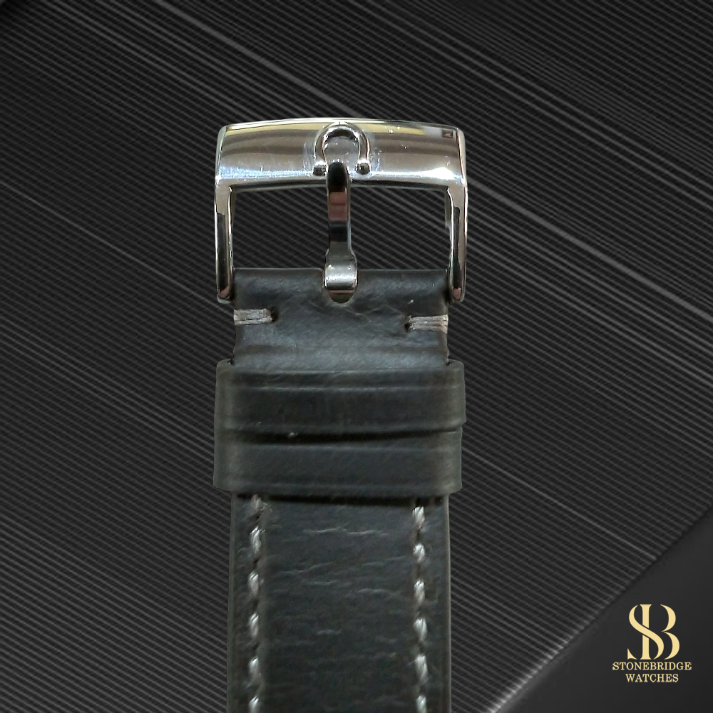 Paired with a vintage style soft and supple black leather strap and Omega signed buckle
