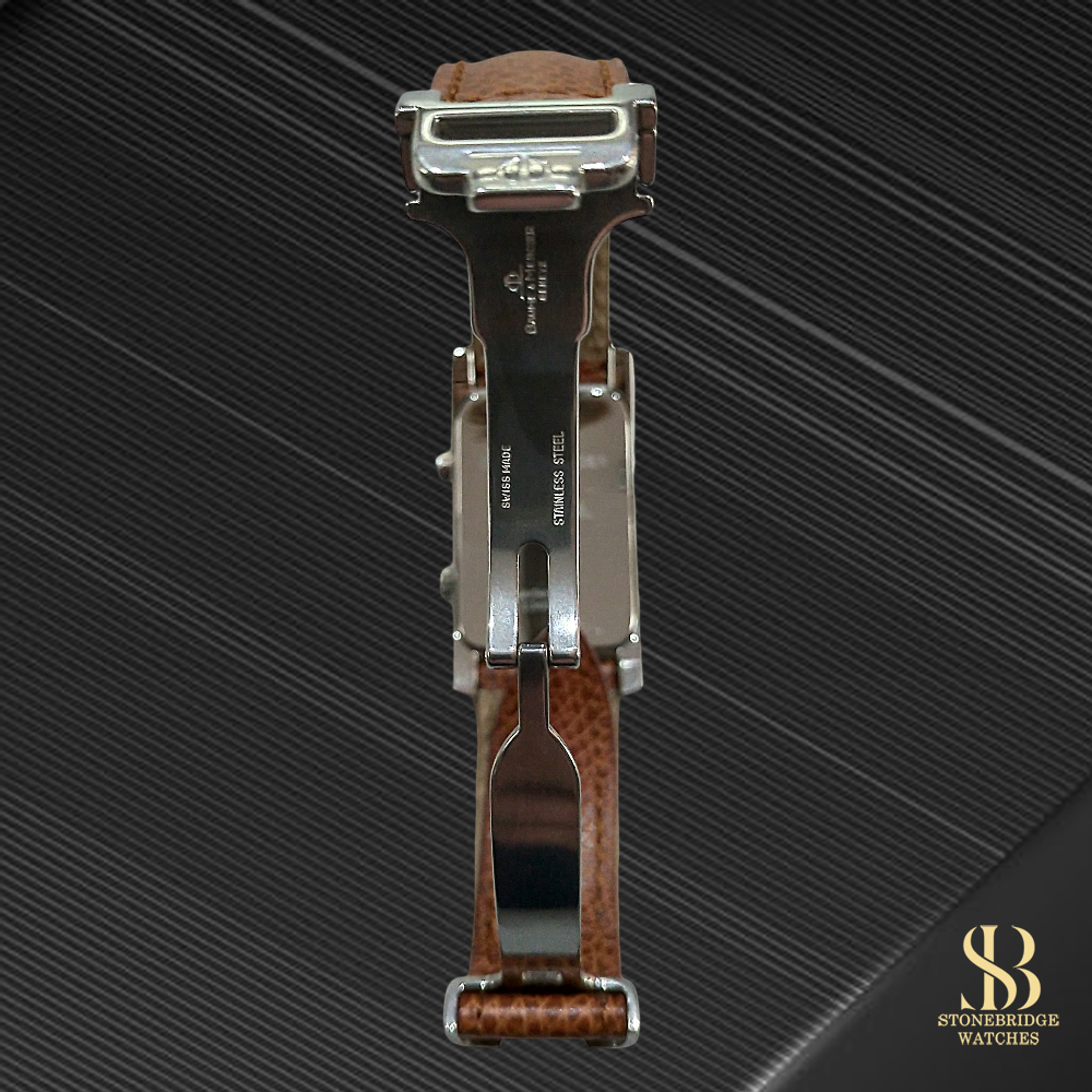 A polished stainless-steel case enhances the watchs geometric lines, giving it a timeless Art Deco appeal. The two-push button configuration ensures easy adjustment of each time zone.
