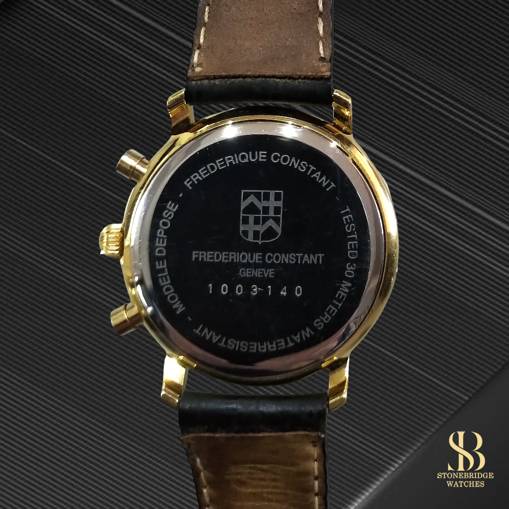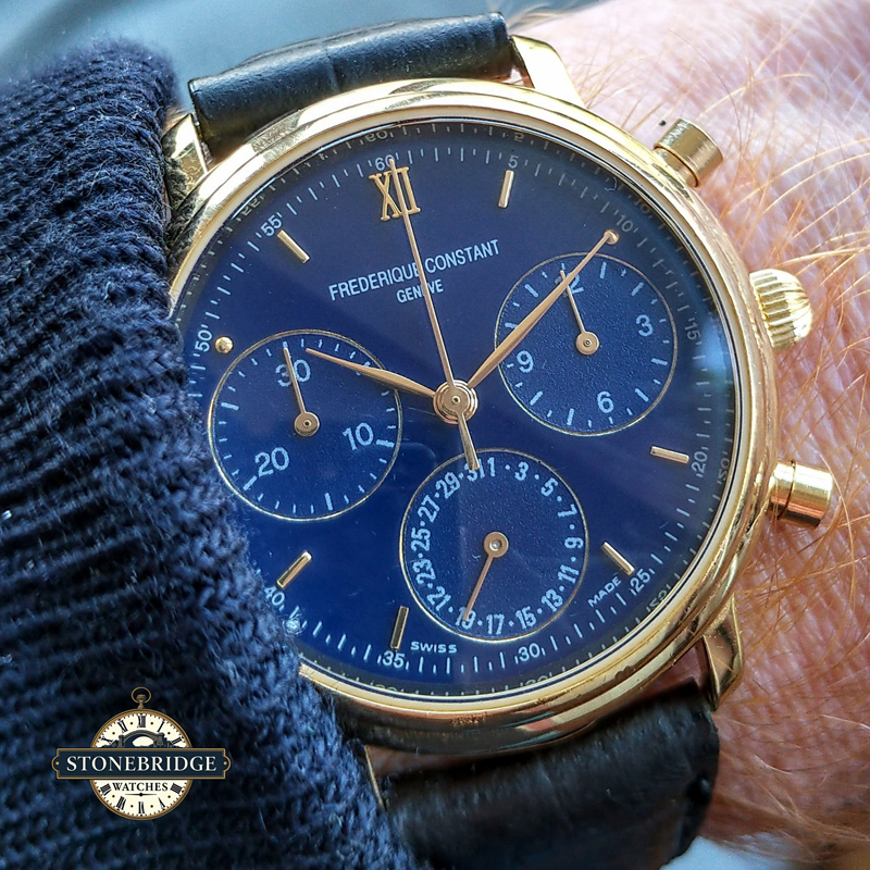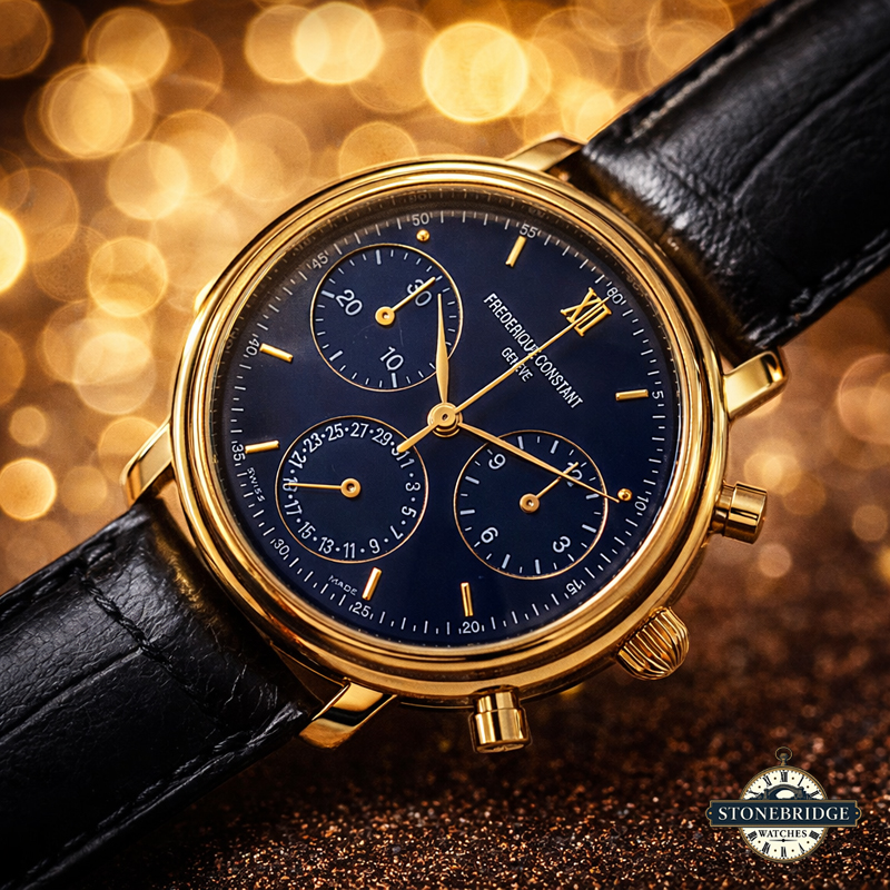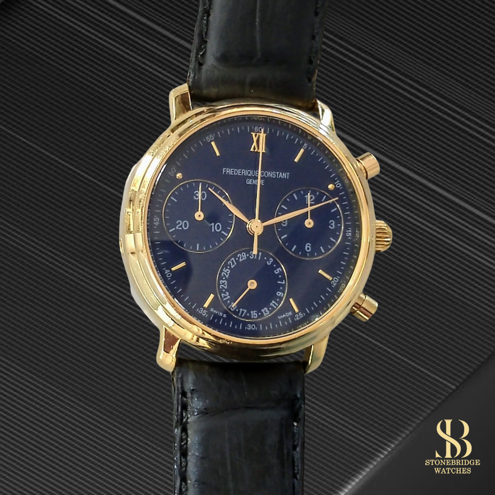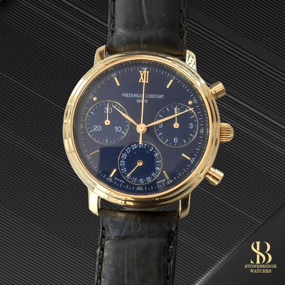 Stonebridge Watches is proud to offer this Frederique Constant Gold Chronograph (Blue Dial)