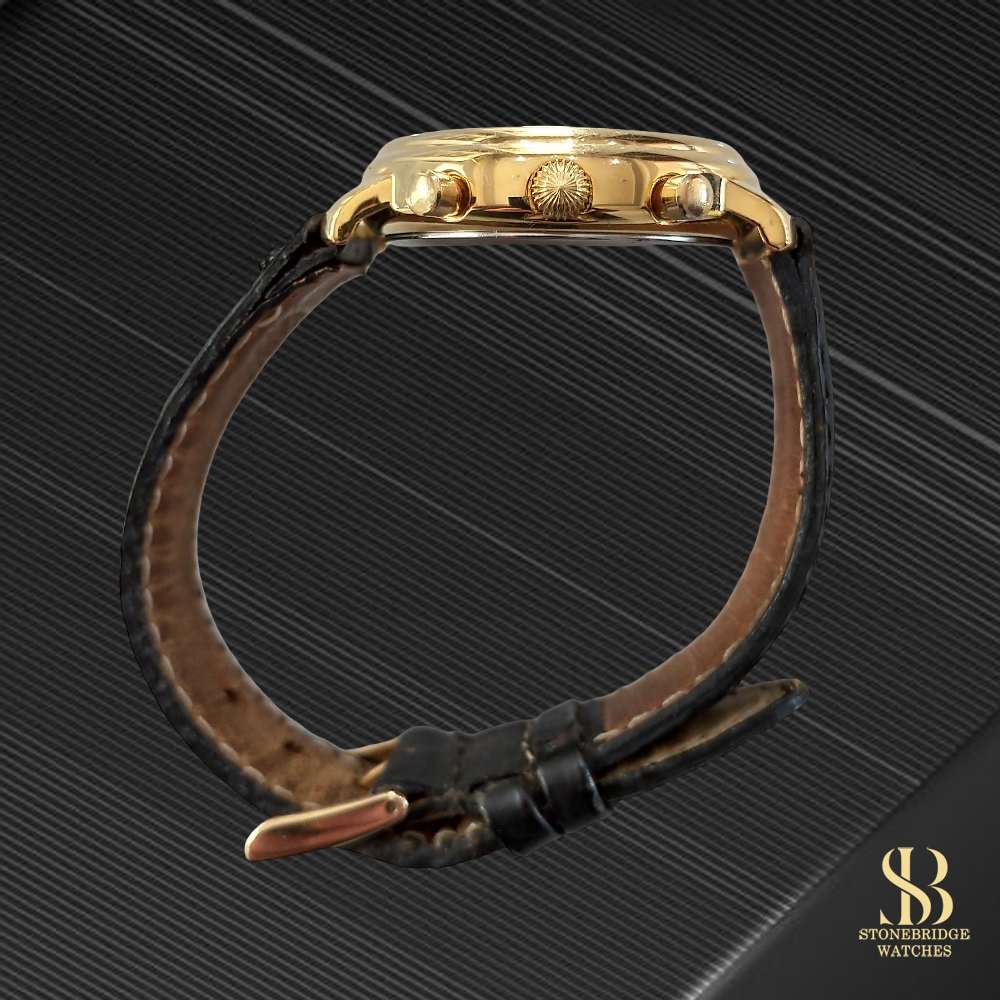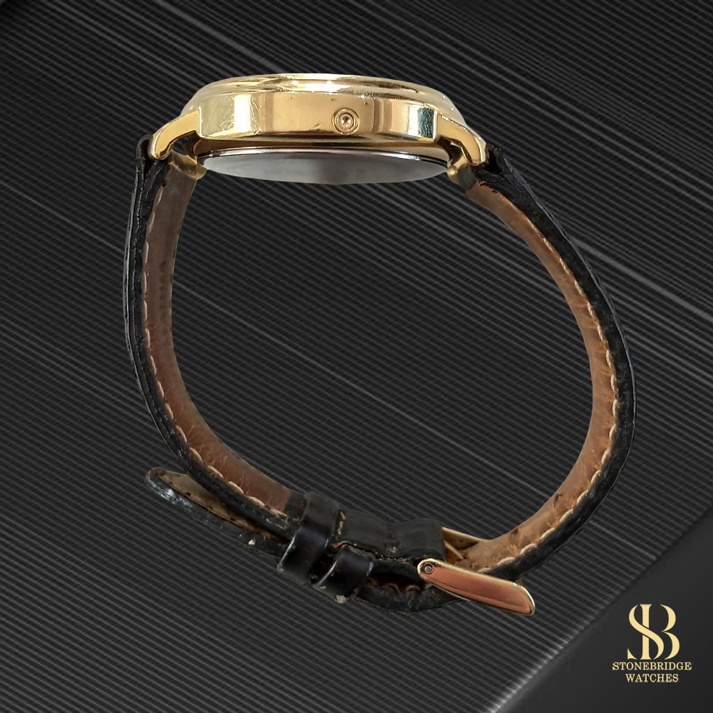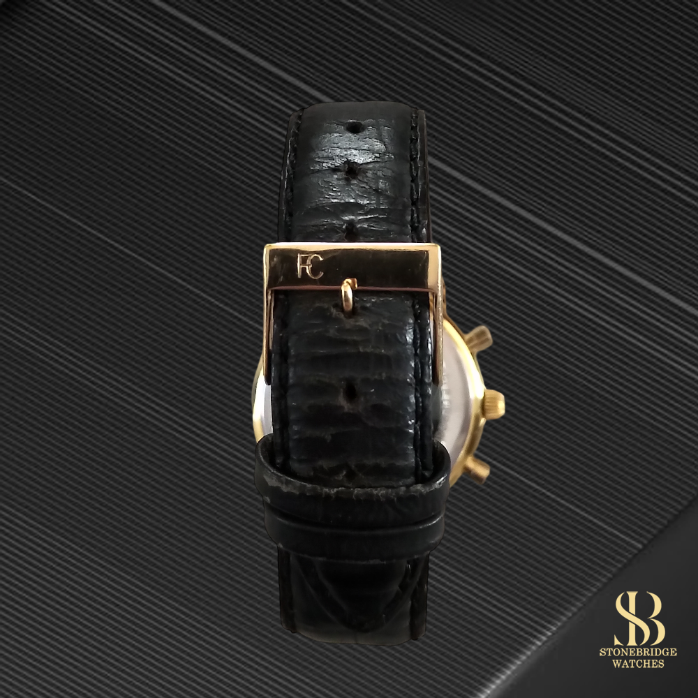 In excellent overall condition, the watch shows only light signs of wear consistent with careful use. The gold plating remains strong, the dial is clean and well-preserved, and the watch is functioning exactly as it should. The watch is paired with a black leather strap and includes the original gold FC buckle.