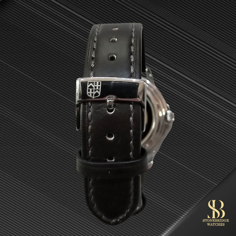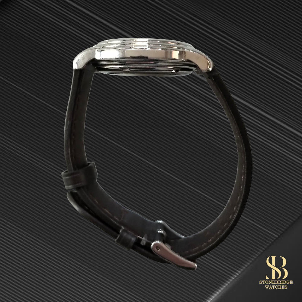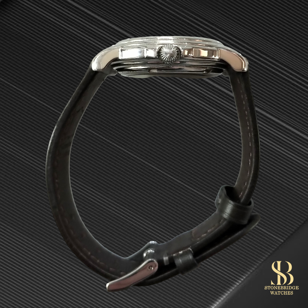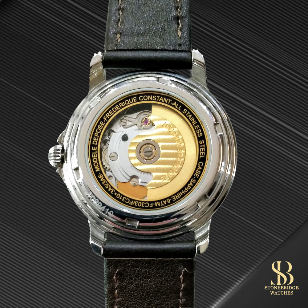This example is paired with a new, high-quality soft and supple black leather strap, finished with a Frederique Constant signed buckle, ensuring both comfort and a cohesive, original feel. The overall presentation makes this a ready-to-wear piece that requires no immediate expense or adjustment.