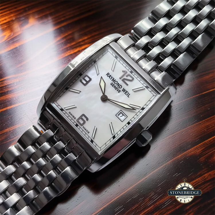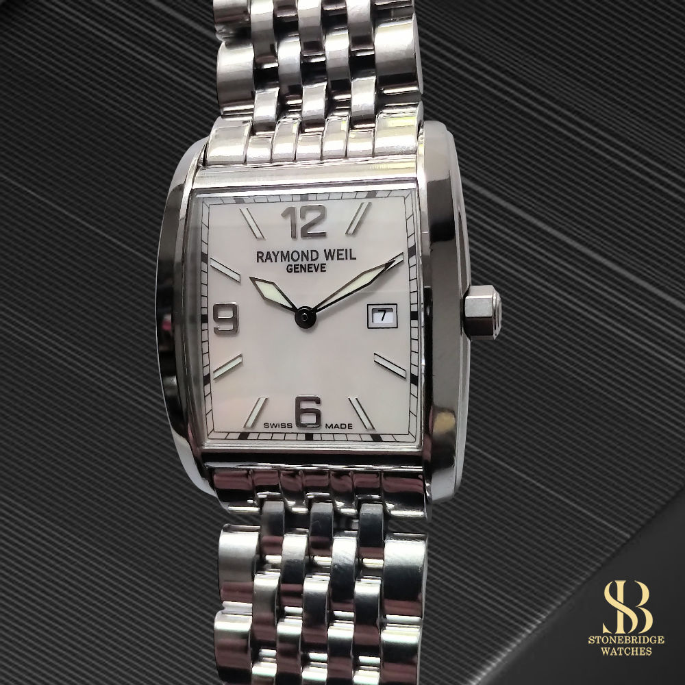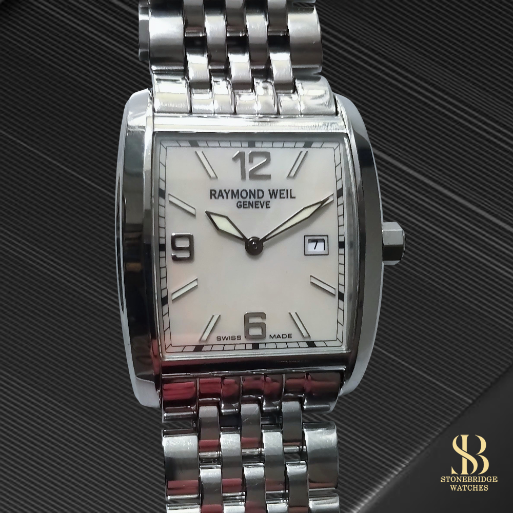 Powered by a reliable Swiss quartz movement, the watch benefits from a newly fitted battery and is ready for immediate wear. It is presented in excellent overall condition, with clean surfaces and a well-preserved dial that remains the focal point of the piece. In addition to the steel bracelet, the watch will be supplied with an extra black leather strap, offering the option to transform its character from refined everyday wear to a more classic dress aesthetic. It will also be accompanied by a Raymond Weil branded travel case, ideal for storage or transport.