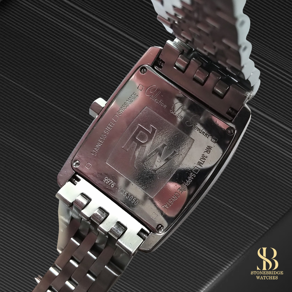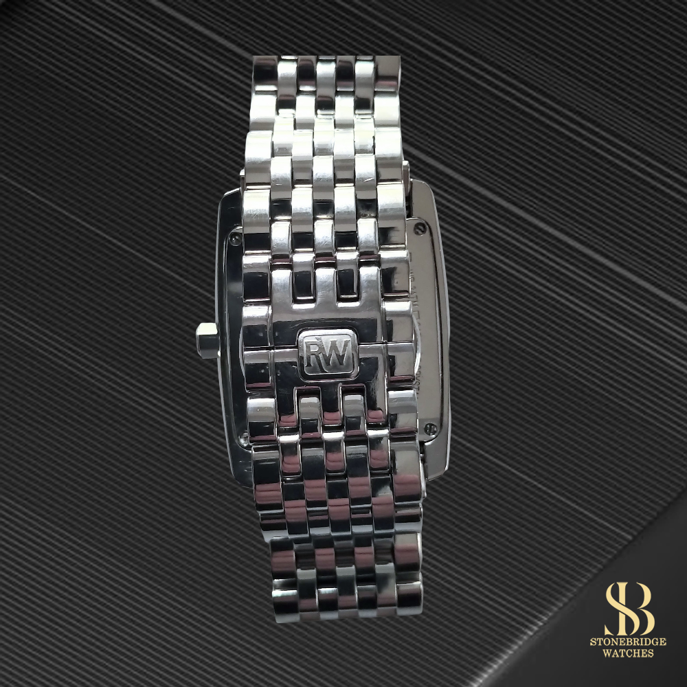 Housed in a polished stainless steel case, the watch is complemented by its original multi-link bracelet, which adds both comfort and a more contemporary edge to the traditional tank-style design. A discreet date aperture at 3 oclock provides everyday practicality, while the slim profile ensures the watch sits neatly under a cuff. Although rectangular in form, the proportions translate to a wrist presence comparable to wearing a traditional 36mm round watch, making it versatile and easy to wear across a range of wrist sizes.