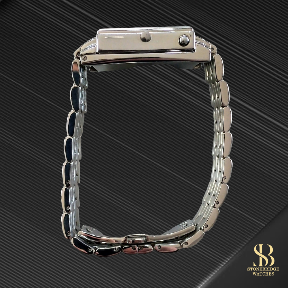 Crafted in polished stainless steel and paired with its original multi-link bracelet, this piece wears comfortably while maintaining a strong wrist presence.