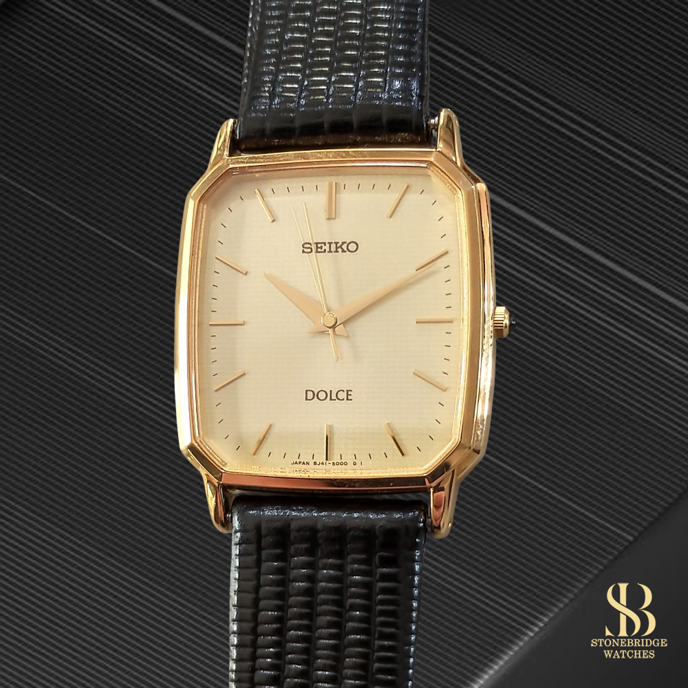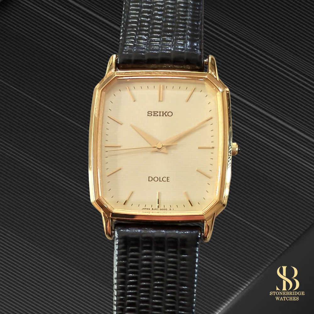 A refined expression of mid-century dress watch design, this Seiko Dolce Tank 8J41-5000 captures the essence of understated elegance, elevated by one of Seikos most precise quartz movements.