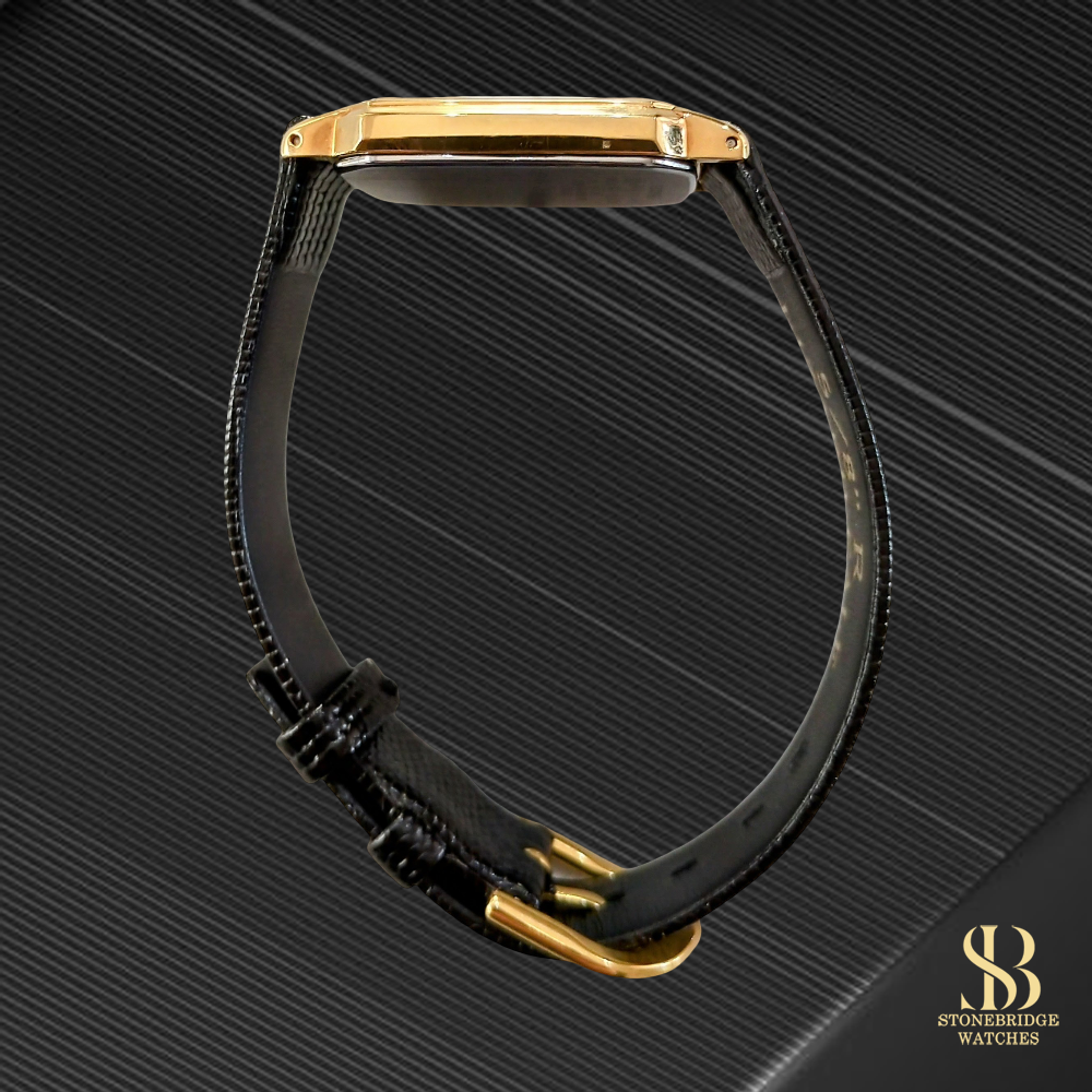 Its classic tank-style case measures approximately 27mm across (excluding the crown), delivering authentic vintage proportions that wear with elegance and restraint. The case is finished in Seikos SGP 30 gold plating, retaining a bright, even tone, and is complemented by an ultra-slim profile of around 56mm, allowing it to sit effortlessly beneath a cuff.