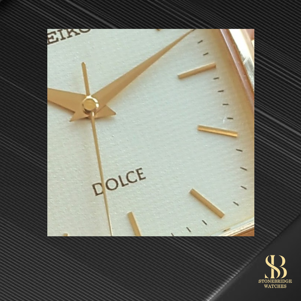 The watch features a beautifully preserved linen-textured champagne dial, offering subtle depth and texture that shifts gently under light. Applied baton hour markers and fine dauphine hands maintain a clean, balanced aesthetic, while the signature Dolce text adds a discreet nod to Seikos premium dress offering of the time.