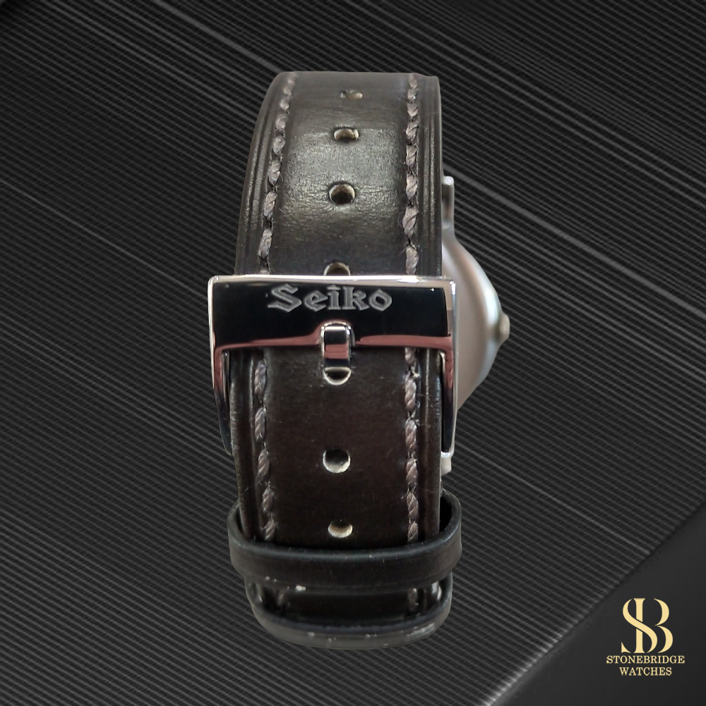 The watch is paired with a new quality leather strap, fitted with a Seiko-signed buckle, completing the piece with a cohesive and considered finish.
