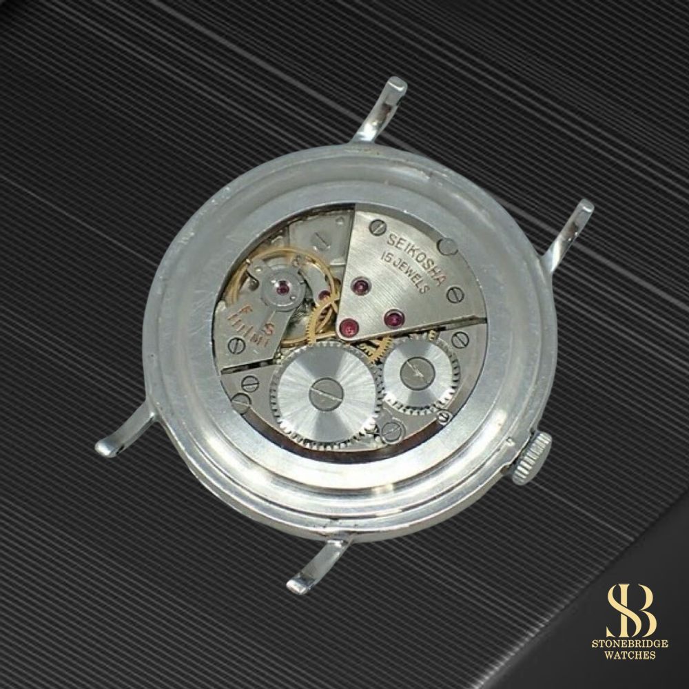 Housed in a slim stainless steel case, the watch wears comfortably on the wrist and embodies the restrained proportions typical of mid-century dress watches. The caseback is stamped with the early Seikosha S mark, a subtle but desirable detail confirming its correct period manufacture.