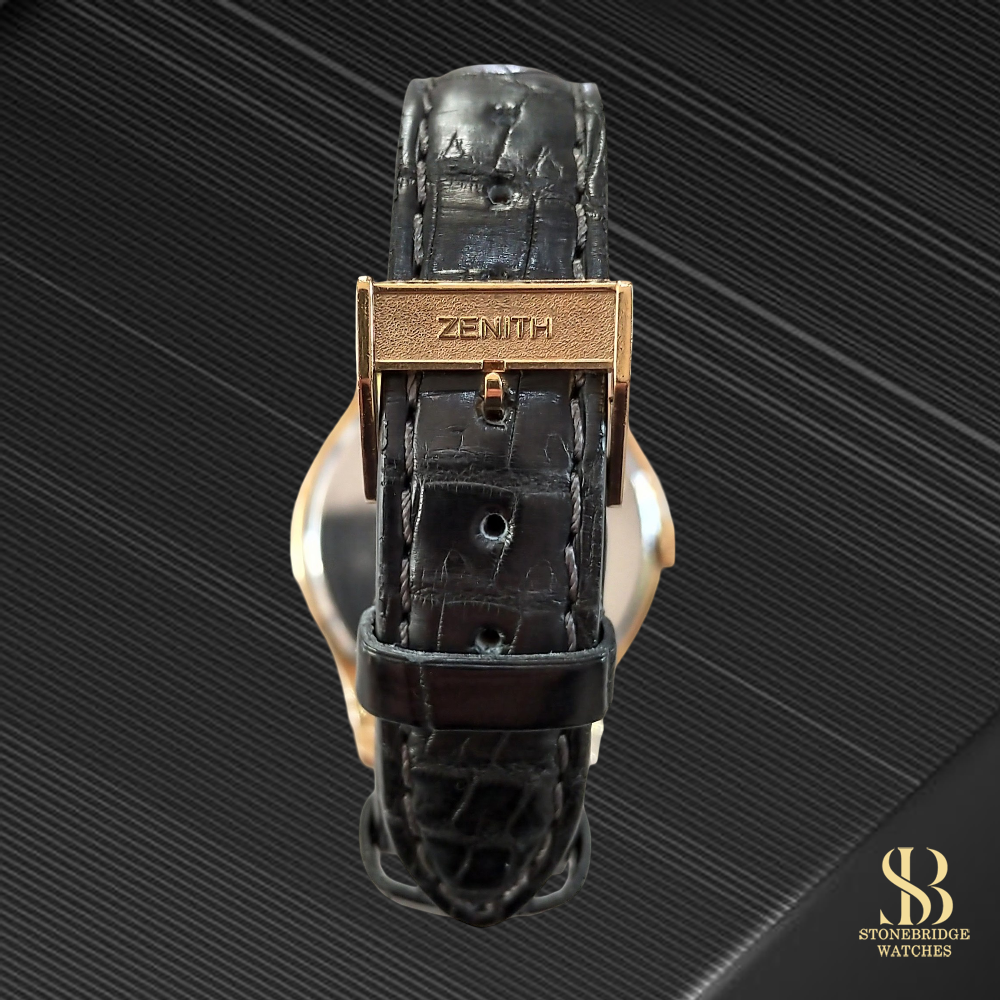 The watch is paired with a quality leather strap, fitted with a matching gold Zenith-signed buckle, completing a cohesive and period-correct presentation. The caseback is finished in stainless steel (Fond Acier Inoxydable), a practical design choice often used to enhance durability while maintaining the luxurious gold aesthetic on the wrist.