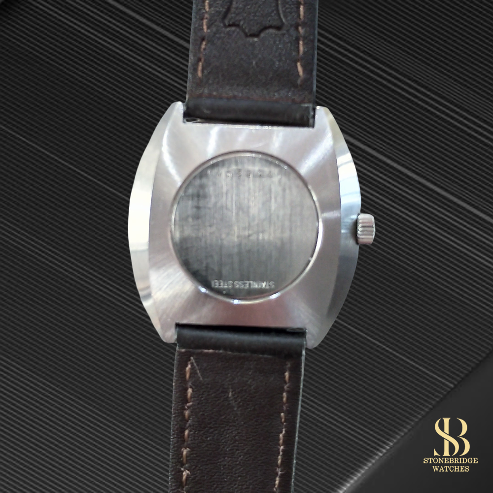 The stainless steel case is the classic 1970s C-case design, measuring approximately 3536 mm, and features a monobloc front-loading construction a design intended to improve water resistance and structural integrity. The watch presents beautifully on the wrist with elegant proportions that remain highly wearable today.