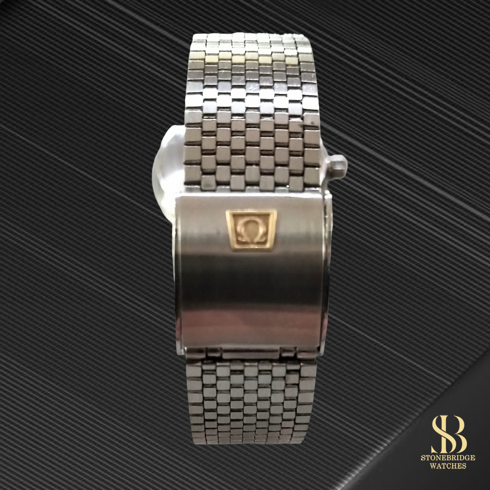 Equally impressive is the integrated mesh bracelet, which is presented in excellent condition and pairs perfectly with the watchs refined aesthetic. Its texture and fluidity enhance both comfort and visual appeal, offering a cohesive vintage look. For added versatility, the watch will also be supplied with an additional black leather strap fitted with an Omega-signed buckle, allowing the wearer to easily transition between a more formal or relaxed style.