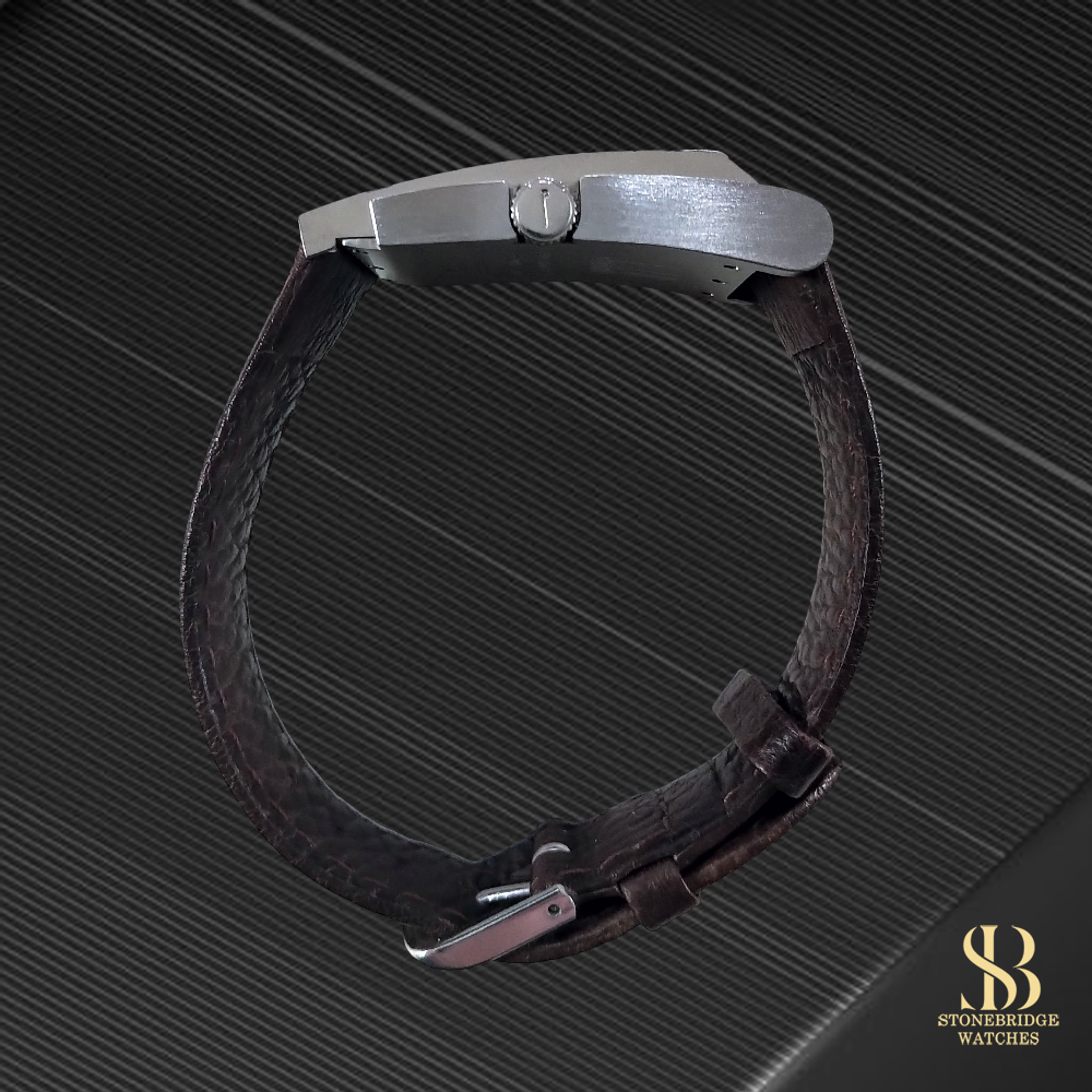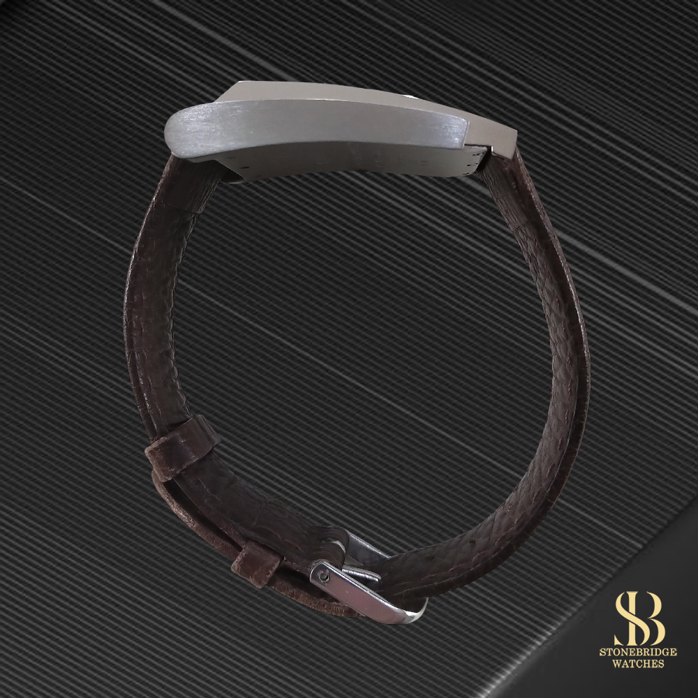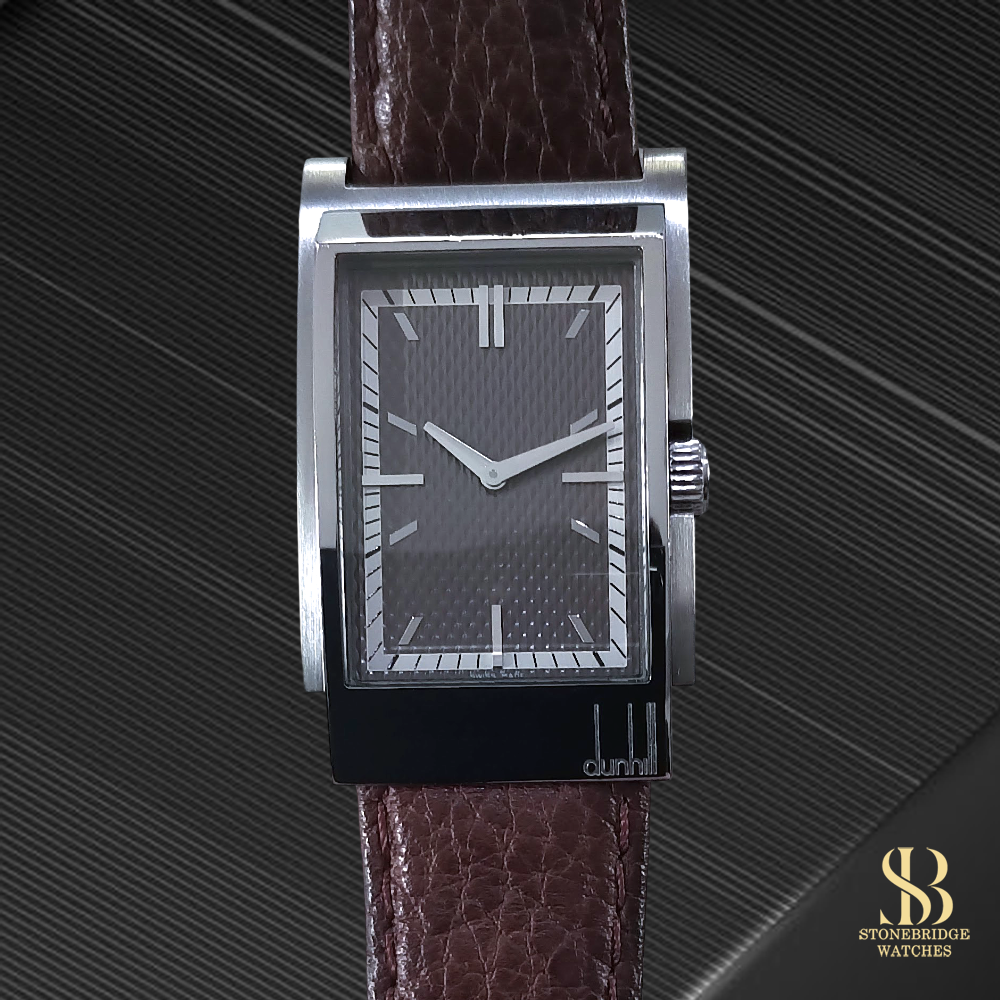 A refined expression of modern British design, this Dunhill Wayfarer offers a distinctive and understated presence on the wrist. The sharply defined rectangular stainless steel case frames a richly textured brown dial, whose intricate wave pattern catches the light beautifully, adding depth and character that is often lost in flatter designs. Applied baton hour markers and sleek hands maintain a clean, architectural aesthetic, while the subtle contrast between the dial texture and chapter ring ensures excellent legibility.