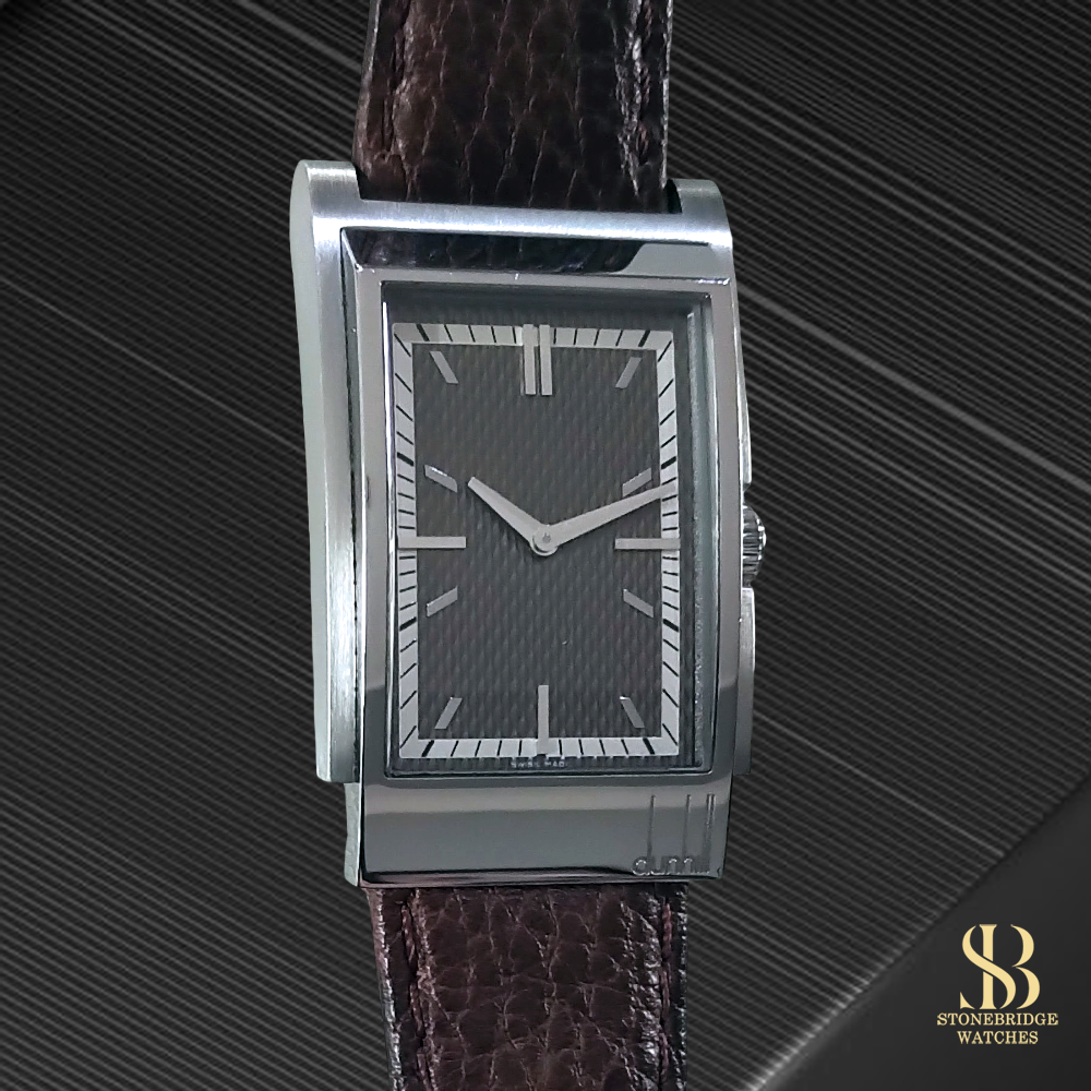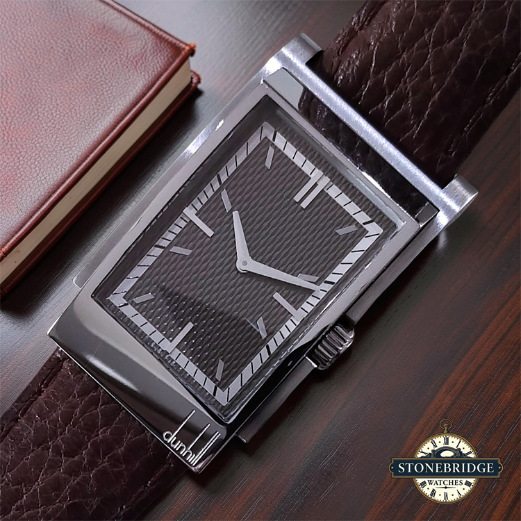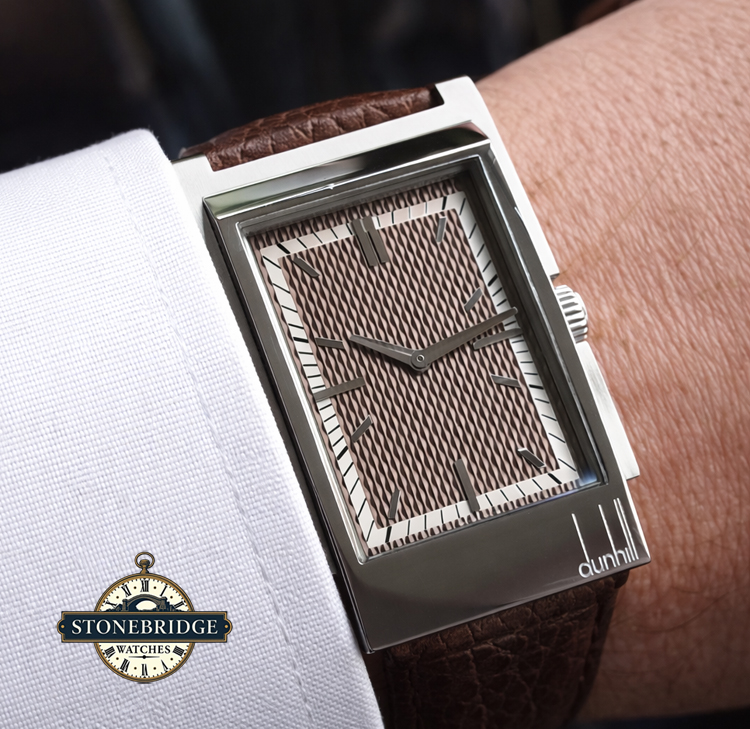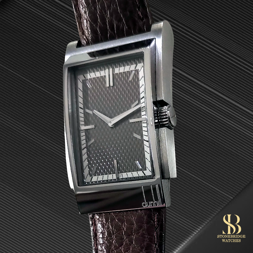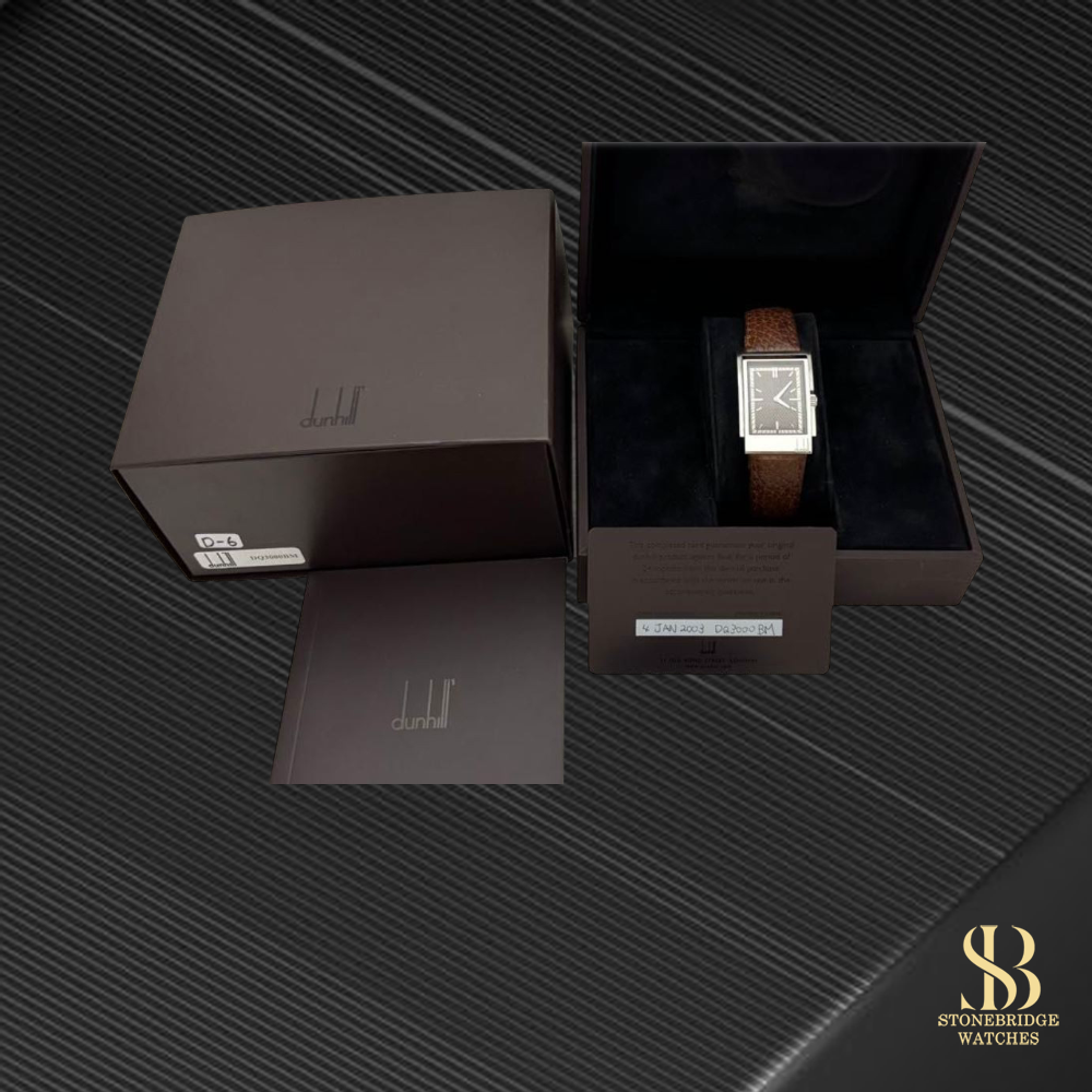 At Stonebridge Watches, we are always looking for distinguished and design-led timepieces, particularly those with elegant tonneau or rectangular forms that stand apart from the ordinary. Pieces such as this Dunhill Wayfarer perfectly capture that ethos, offering both individuality and refined styling. Priced at under £400, we believe this watch represents exceptional value for a complete, boxed example of such distinctive character.