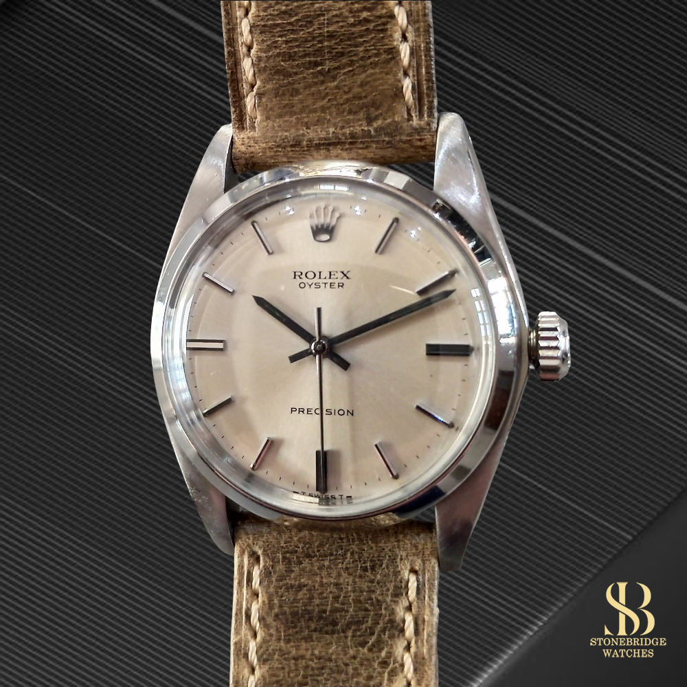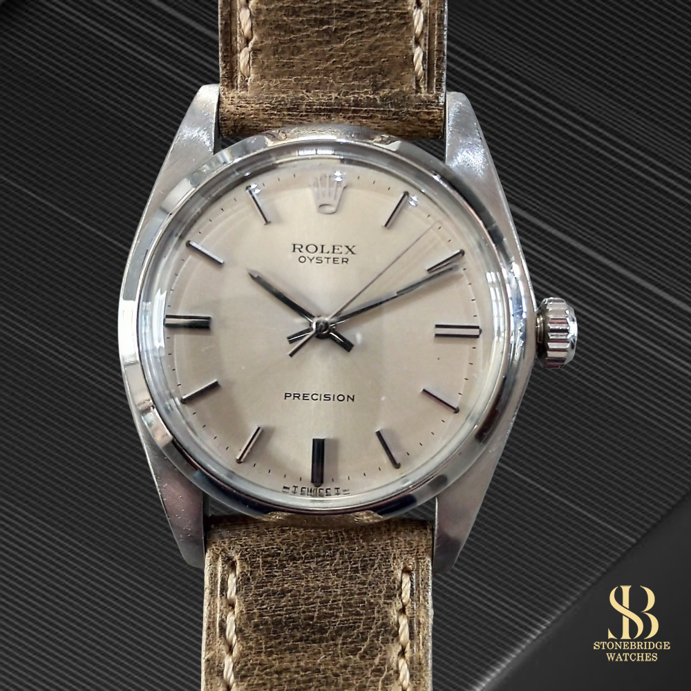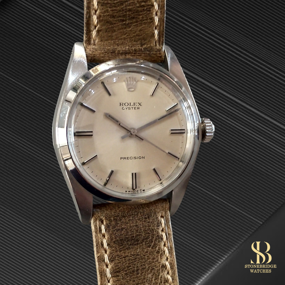 The standout feature is the original silver sunburst dial, which has developed a warm, even patina over time, giving the watch a character that cannot be replicated. Applied baton hour markers and slim hands maintain the minimalist aesthetic, while the Oyster Precision text reflects the traditional hand-wound movement that makes these references so appealing to purists.