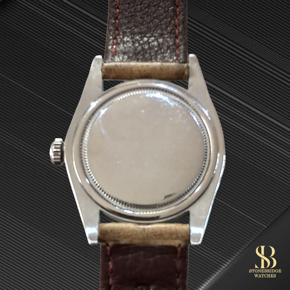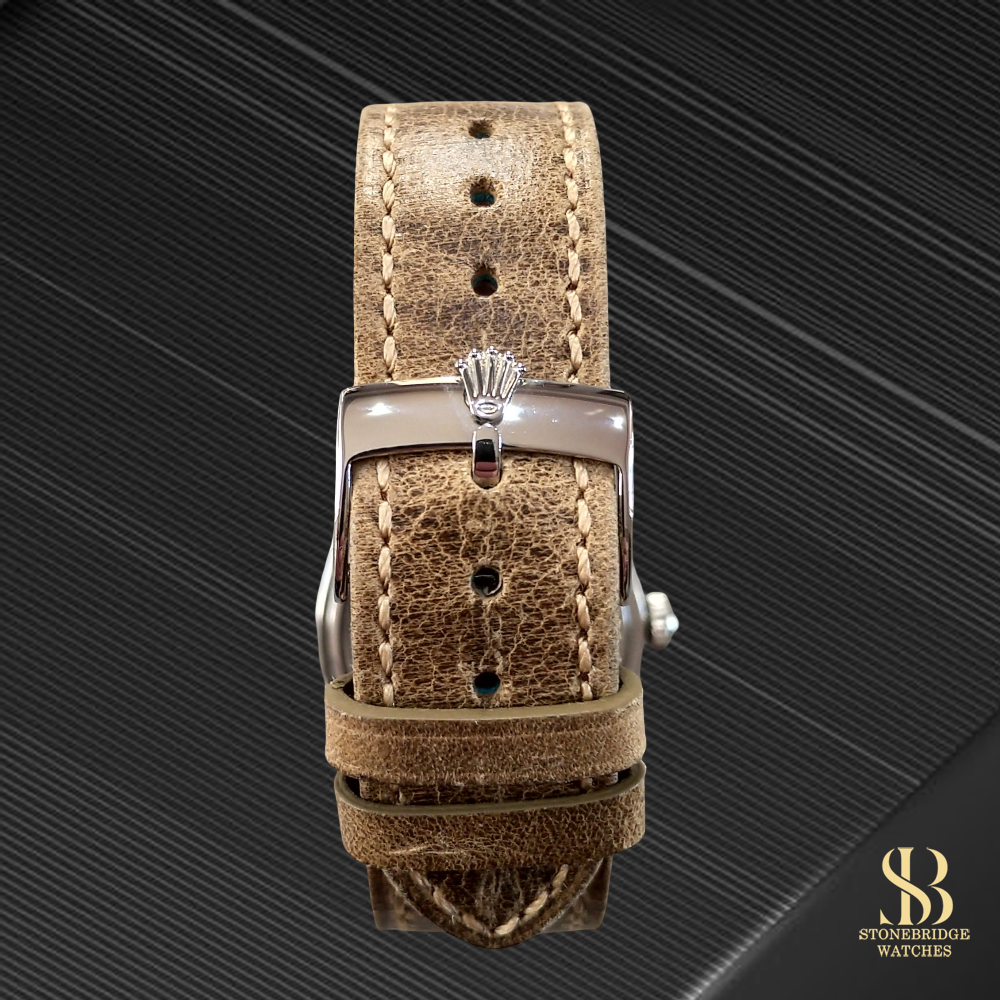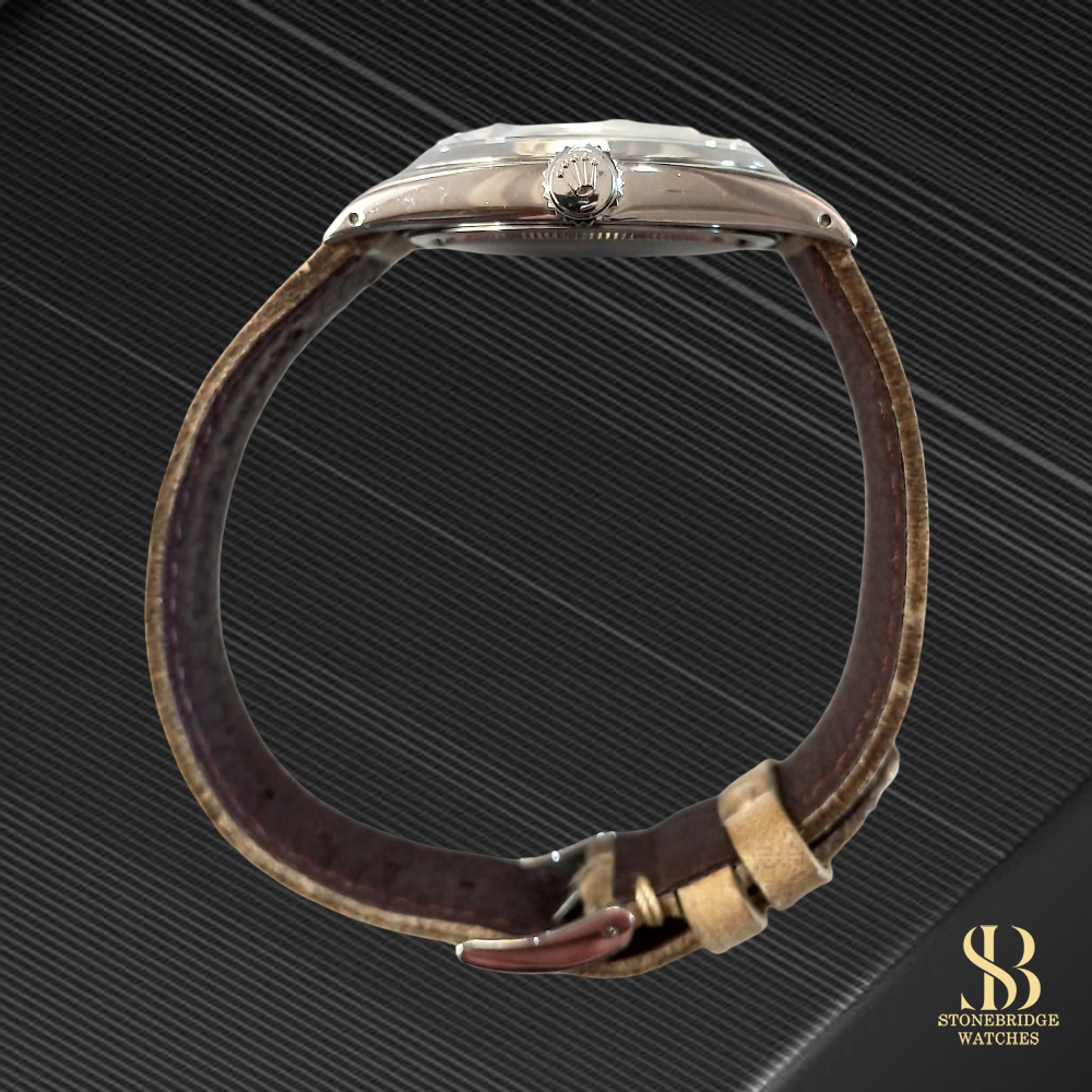 The stainless steel Oyster case remains in excellent vintage condition, showing crisp lines and a classic mid-size profile that wears comfortably on the wrist. The watch is fitted with a soft and supple vintage-style leather strap, paired with a Rolex-signed buckle, completing the period-correct look.