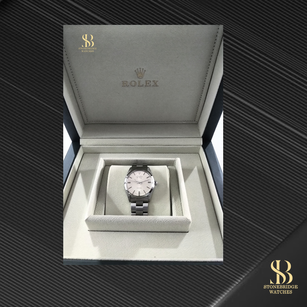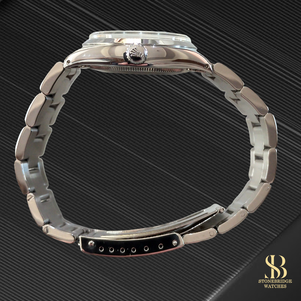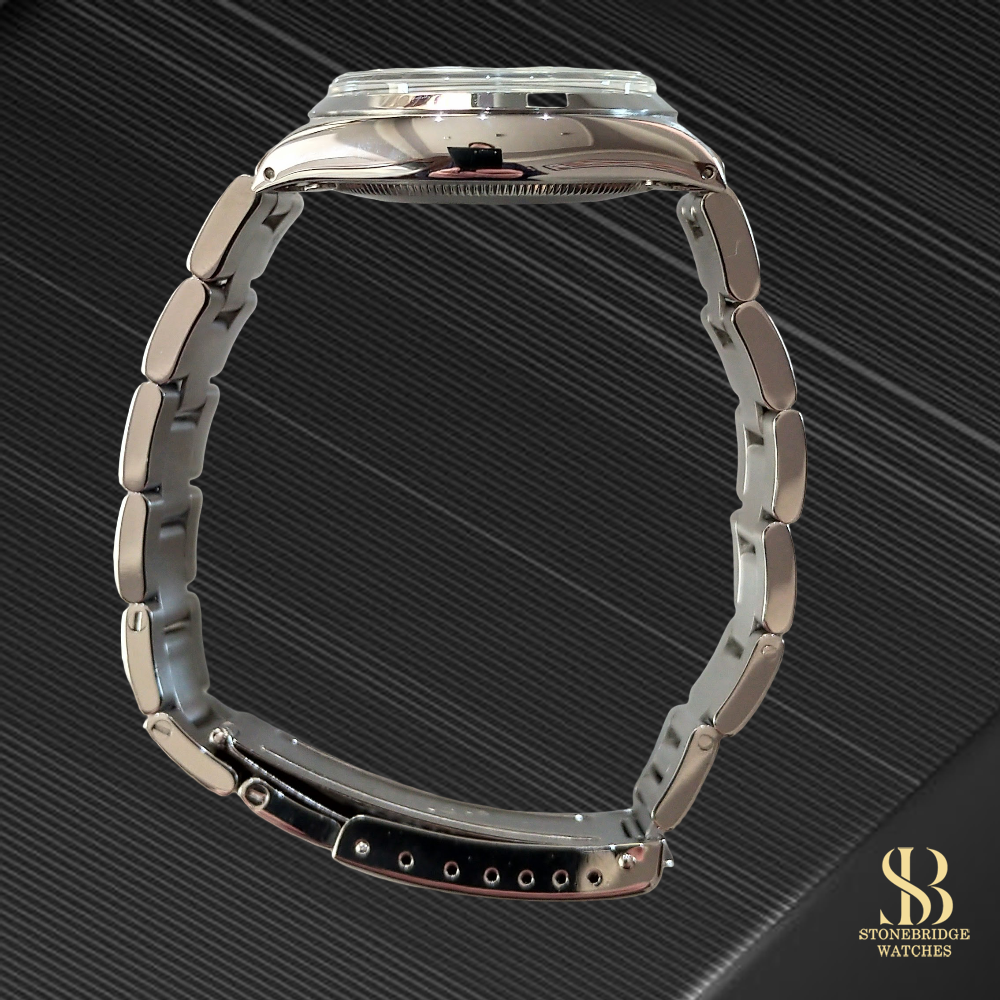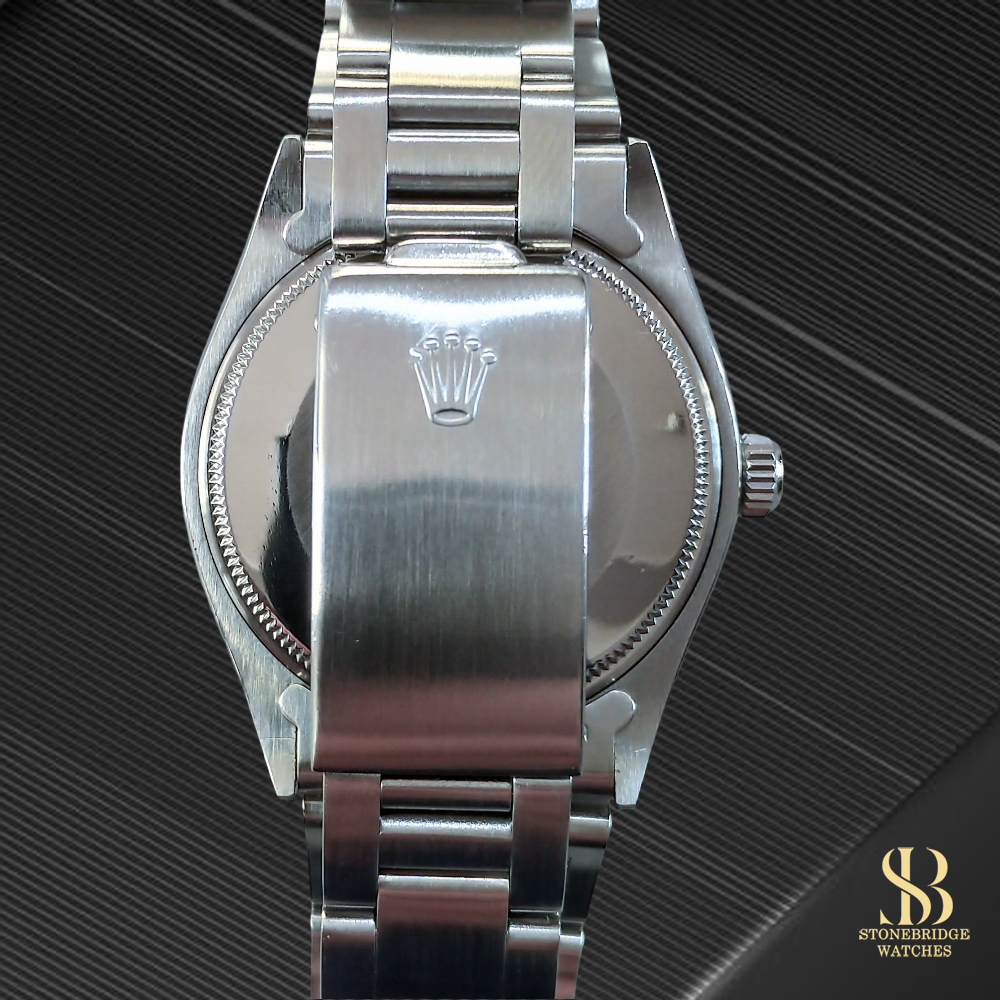 The watch is housed in the traditional 34mm stainless steel Oyster case with smooth bezel and screw-down crown, offering the balanced and highly wearable proportions that have made the Air-King 5500 a favourite among collectors for decades. The case is in very good condition with strong lugs and good overall definition, showing only light signs of careful use.