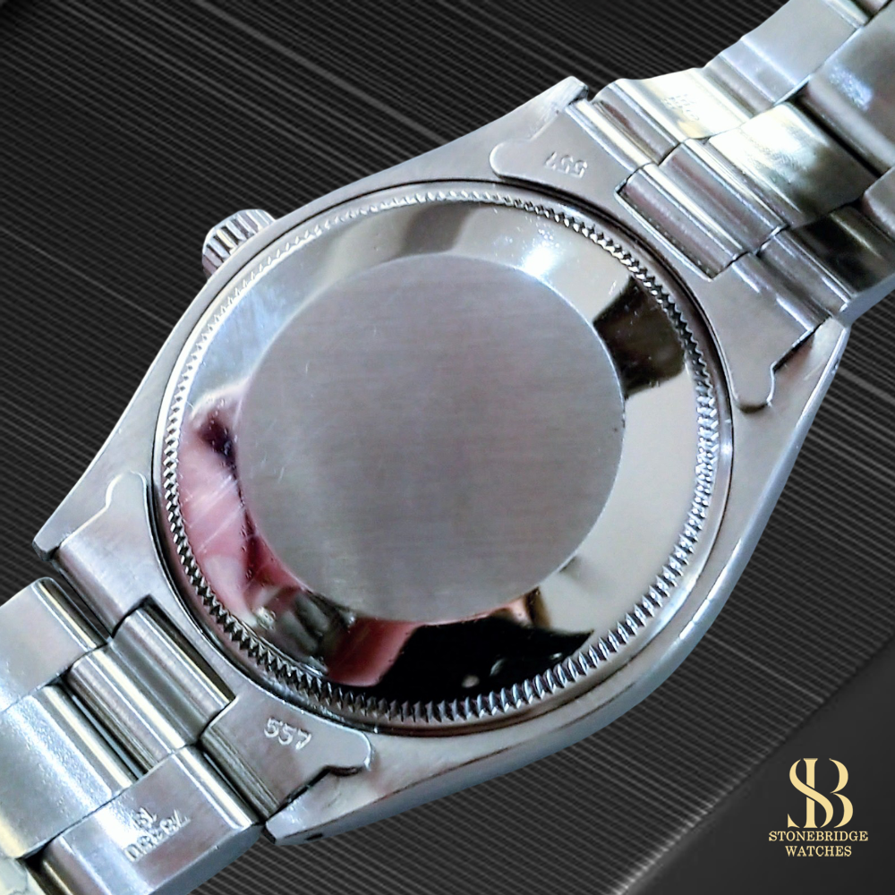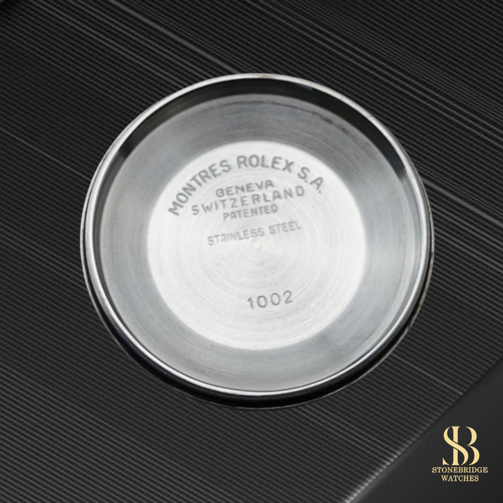 This watch retains a Rolex caseback stamped reference 1002, a detail frequently encountered on later Air-King models. During the 1970s1980s period Rolex often used shared Oyster case components across the Air-King 5500 and Oyster Perpetual 1002, and examples with this caseback configuration are well documented. The correct model reference remains 5500 between the lugs, with the 1002 marking relating to the caseback type used by Rolex at the time.