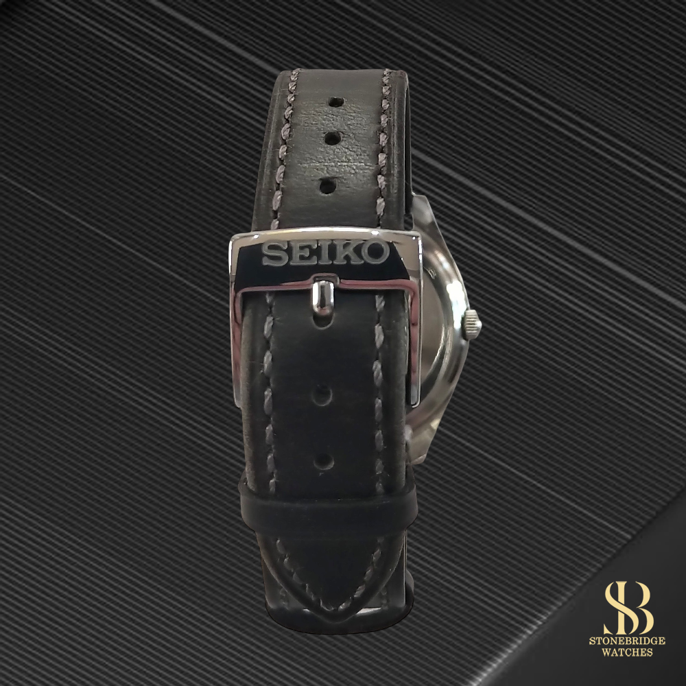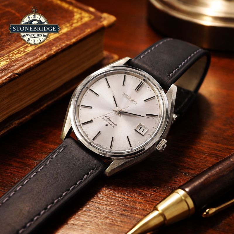 This particular example is presented in excellent condition, a testament to careful ownership over the decades. At its heart beats the hand-wound Seiko Calibre 6100, a dependable 21-jewel movement known for its durability and impressive level of accuracy, making it as practical today as it was over half a century ago. The watch has been thoughtfully paired with a new vintage-style soft and supple strap, finished with a Seiko-signed buckle, ensuring both comfort on the wrist and a cohesive, period-correct look.
